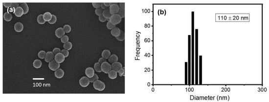In order to test the activity of phospholipase A2 (PLA2) as a model biomolecular interaction in the subsequent experiments, liposomes should be prepared with a phospholipid that can be hydrolyzed by the enzyme. Among the potential candidates that are readily available, DMPC was selected as a suitable phospholipid to prepare liposomes for this study. For example, DPPC (1,2-dipalmitoyl-sn-glycero-3-phosphocholine) with two more methylene groups in the chain than DMPC can exist in a non-permeable solid state, which is not appropriate for this study, at room temperature (Tm ~ 41 °C). On the other hand, DLPC (1,2-dilauroyl-sn-glycero-3-phosphocholine) with two fewer methylene groups in the chain than DMPC can exist in a leaky liquid state, which might not retain the encapsulated Cys effectively, at room temperature (Tm ~ −2 °C). Thus, we reasoned that DMPC, whose transition temperature (Tm ~ 24 °C) is close to room temperature, could be a proper candidate because the properties of the resulting liposomes including permeability can be manipulated around room temperature by controlling their composition. The CELPs were formulated from lipid films with DMPC:Chol molar ratios of 60:40 and 40:60. Cholesterol is an essential constituent of most biological membranes and the cholesterol content in a membrane bilayer determines the properties of the membrane []. The hydrogen bond between the hydroxyl group in cholesterol with DMPC has been investigated to understand the role of cholesterol in biological membranes []. Cholesterol can improve the packing of lipids and affect the fluidity and elasticity. Especially, cholesterol can influence the permeability of water and small chemical species and it is widely used to formulate liposomes for drug delivery []. The SEM image in Figure 1a shows the spherical shape of the CELP with a homogeneous size distribution. The DLS analysis confirmed the narrow size distribution of the liposomes, and the average diameter was measured to be 110 ± 20 nm probably due to somewhat aggregation, as shown in Figure 1b. DLS analyses were performed using a Brookhaven light scattering system (BI9000AT/200SM) with a Lexel model 95 argon ion laser at 488 nm.
