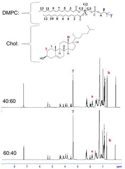 1H NMR spectra of liposomes formulated from the lipid films with DMPC:Chol molar ratios of 40:60 and 60:40. The a indicates the peak at 1.83 ppm from two protons on carbon 1 and one proton on carbon 2, and the b indicates the peak at 0.68 ppm from three protons on carbon 18 in cholesterol.