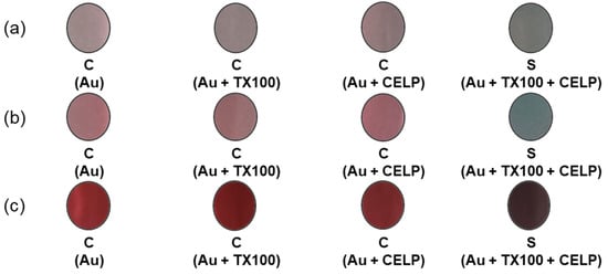 For the visibility test, the aggregation of AuNPs at three different concentrations (0.06 mM, 0.12 mM, and 0.24 mM) was tested with cysteine-encapsulated liposomes and Triton X-100 (Au + TX100 + CELP) in HPLC grade water at pH 7. For comparison, the aggregation of AuNPs was also investigated under the following conditions: (1) in the absence of Triton X-100 and the liposomes (Au), (2) in the absence of the liposomes (Au + TX100), and (3) in the absence of Triton X-100 (Au + CELP). After the 1 h incubation of all testing aqueous solutions (just water, TX100, CELP, and TX100 + CELP), AuNPs were added, and the color changes were recorded after 10 min of the addition. According to Figure 3, the samples without Triton X-100 and/or liposomes (Au, Au + TX100, and Au + CELP) maintained the original red color of AuNPs, but the sample with the liposomes treated with Triton X-100 (Au + TX100 + CELP) exhibited visual color transitions.