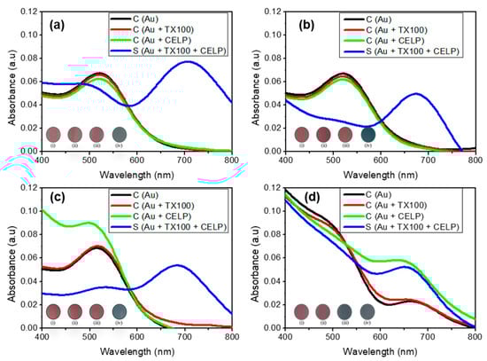 The UV–vis spectra of 0.12 mM AuNPs in various conditions and media: neutral pH (a), phosphate buffered saline (pH 7.4) (b), HCl-adjusted water (pH 5) (c), and phosphate buffer saline (pH 5.2) (d). Insets show the corresponding photographs of AuNPs: only AuNPs (i); AuNPs with TX100 (ii); AuNPs with CELP (iii); AuNPs with TX100 and CELP (iv).