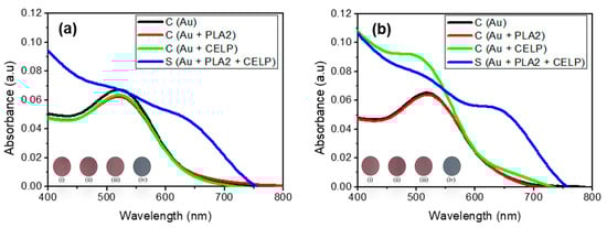 Figure 5 shows the UV-vis spectra of Au, Au + PLA2, Au + CELP, and Au + PLA2 + CELP tested in HPLC water (pH 7) and PBS (pH 7.4). All spectra of control samples (Au, Au + PLA2, and Au + CELP) showed only one peak at around 520 nm in both media, which indicates that only PLA2 or CELP do not induce the aggregation of AuNPs under the given conditions. The Au + CELP in PBS at pH 7.4 showed a slight increase in absorbance at around 690 nm but no visible color change was observed (iii in the inset in Figure 5b). The results show that the cysteine-encapsulated liposomes are reasonably stable at a neutral pH and the leakage of cysteine is not detectable. In contrast, when both PLA2 and cysteine-encapsulated liposomes were added to gold nanoparticles (Au + PLA2 + CELP), a new peak around 650–700 nm increased significantly in both media, leading to a distinct red-to-blue color change. Such changes suggest that PLA2 induces the leak of cysteine from the liposomes and the released cysteine can facilitate the aggregation of gold nanoparticles. As explained above, it is known that the hydrolysis products from L-phospholipids by PLA2 can desorb from the liposomes, resulting in the release of cysteine. Overall, the results from the test of PLA2 demonstrated that the cysteine-encapsulated liposomes can be successfully used to investigate biological interactions occurring at cell membranes.