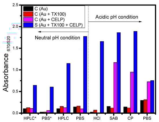 From the UV-vis spectra data shown in Figure 4 and Figure 5, the absorbance ratio measured at 670 nm and 520 nm was calculated and used to estimate the degree of aggregation of gold nanoparticles. Figure 6 shows the absorbance ratio (A670/520) for Au, Au + TX100, Au + CELP, and Au + TX100 + CELP in various media and the asterisk indicates the data obtained from PLA2 instead of Triton X-100. In Figure 6, Au and Au + TX100 (or Au + PLA2) showed the absorbance ratio less than 0.3 in all tested media without a noticeable sign of aggregation of nanoparticles. However, Au + CELP showed significantly increased absorbance ratios in acidic buffer media, demonstrating the possible leak of cysteine from the liposomes, and resulting aggregation of nanoparticles. The results might suggest the limited stability of cysteine-encapsulated liposomes in acidic buffer solutions and the use of the liposomes as a colorimetric sensor under such conditions should be applied more cautiously. In contrast, at neutral pH regardless of media, Au, Au + TX100 (or Au + PLA2), and Au + CELP did not show any perceptible increase in the absorbance ratio (A670/520), and the presence of Triton X-100 or PLA2 could be selectively confirmed by monitoring the UV-vis spectra or observing visible color change.