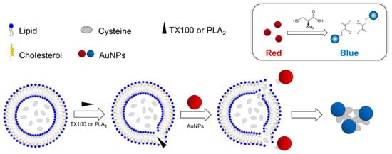 (Top) The aggregation and colorimetric response of AuNPs induced by Cys. (Bottom) The release of encapsulated Cys by TX100 or PLA2 from the liposomes and the subsequent aggregation of AuNPs.