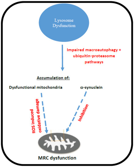 An impairment in autophagy as a consequence of lysosomal dysfunction has been reported to result in an accumulation of functionally compromised peroxisomes, which exhibit an imbalance between the ROShydrogen peroxide generation, as a by product of their acyl-CoA oxidase activity, and their antioxidant catalase enzyme activity, which can eventually result in enhanced cellular oxidative stress, potentially impairing MRC function [40,47]. Moreover, peroxisomal biogenesis defects arising as the result of lysosomal dysfunction may cause an impairment in the synthesis of the phospholipid antioxidant species plasmalogen, which may reduce the capacity of the cell to detoxify ROS, again making the MRC more vulnerable to oxidative damage. Decreased plasmalogen levels have been reported in red blood cells from patients with Gaucher disease, with the level of this antioxidant being found to negatively correlate with the total disease burden. However, no evidence of peroxisomal dysfunction was found in the red blood cells [48].