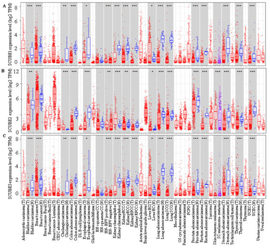 Expression of SCUBE family members in various human tumors. (A) SCUBE1, (B) SCUBE2, and (C) SCUBE3 expression in different cancer types in comparison to adjacent normal tissue. Data extracted from TCGA database determined by tumor immune estimation resource (TIMER) presented as log2-TPM. TPM denotes transcript count per million.