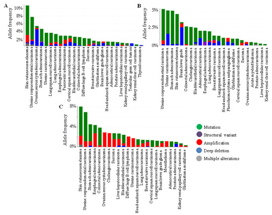 Cancer genomics data (mutation and copy number alterations; CNA) for the SCUBE family, analyzed from 32 studies comprising 10,967 patient’s samples and downloaded through cBioPortal, demonstrated the highest SCUBE1 gene alteration in skin cutaneous melanoma and carcinomas of the uterine corpus, endometrium, ovary, stomach, lungs, breast, colon, and kidneys. SCUBE2 exhibited the highest gene alterations in the uterine corpus endometrial carcinoma and uterine carcinosarcoma, followed by carcinomas of the stomach, skin, brain, bladder, lungs, breasts, ovaries, prostate, and pancreas [9,18,19,20,21,22,23,24,25,26,27]. SCUBE3 showed increased alterations consisting of mutation and amplification in skin cutaneous melanoma, followed by uterine corpus endometrial carcinoma, malignancies of the stomach, esophagus, colon–rectum, ovaries, liver, bladder, breasts, lungs, cervix, brain, prostate, and glioblastoma (Figure 3).