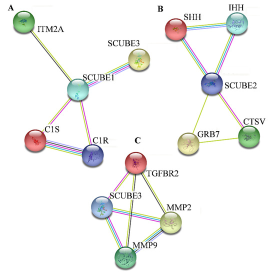 SCUBE family associations with other proteins were derived from STRING database. Network analysis showed the interaction of 10 proteins with SCUBE1, SCUBE2, and SCUBE3 (Figure 4). A direct interaction of SCUBE1 with SCUBE3 and with other proteins includes C1S, C1R, and ITM2A. SCUBE2 directly interacts with CTSV, GRB7, IHH, and SHH proteins. Furthermore, SCUBE3 exhibited direct interaction with MMP2, MMP9, and TGFBR2 proteins. The interaction and association of SCUBE family with other proteins is shown in Table 2, which is based on curated databases, experimental determination, gene neighborhood, and text mining.