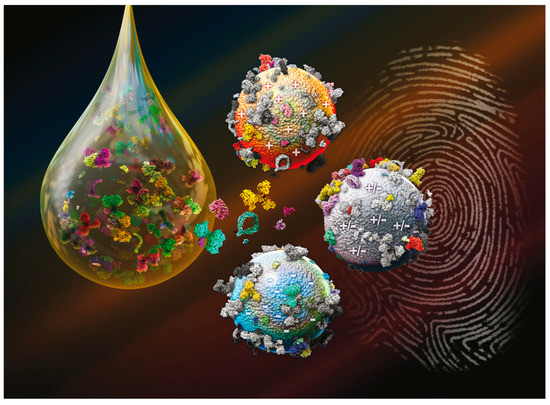 Upon exposure to human plasma proteins, nanoparticles (NPs) are coated by a personalized protein corona. Using a cross-reactive sensor array made of three liposomal formulations, fingerprints for five different cancer types were identified. Adapted from Caracciolo et al. [30].