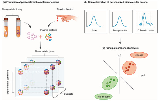 Nanoparticle-enabled blood tests for early cancer detection. (a) Nanoparticles are incubated with human plasma collected from cancer patients and healthy subjects. (b) A library of nanoparticle-protein complexes is generated by exposing different NP types (e.g., gold NPs, GO nanoflakes, liposomes, lipid NPs, etc.) with different physical-chemical properties (e.g., size, aggregation state, shape, surface charge, etc.) to HP under different experimental conditions such as protein concentration, NP/protein molar ratio, temperature, shear stress, etc. This practice results in the development of a big data set of “personalized protein coronas”. (c) For each corona, several physical-chemical parameters are collected.The data set is compacted by principal component analysis (PCA) into a series of new variables (PC1, PC2, etc.). Cancer patients and healthy volunteers give rise to two well-separated clusters in the principal components’ Cartesian plane (“disease” vs. “no disease”). Reprinted with permission from Elsevier from Nano Today, 21, 14–17. (2018), M. Papi and G. Caracciolo. Principal component analysis of personalized biomolecular corona data for early disease detection [4].