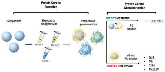 Schematic representation of nanoparticle-enabled blood (NEB) test for personalized PC characterization. Nanoparticles are exposed to biological fluids from different donors giving rise to personalized protein coronas. Direct methods of corona characterization require protein isolation from the particle surface, while indirect methods characterize the whole nanoparticle-corona systems.