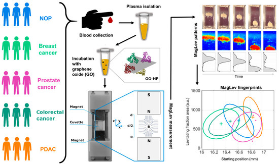 Workflow of the MagLev nanoparticle-enabled blood (NEB) test for cancer detection. Blood from non-oncological patients (NOP) and patients affected by different cancer types is collected. Then human plasma is separated and incubated with NPs such as graphene oxide (GO). NP-HP complexes are injected into a cuvette filled with a paramagnetic medium and inserted into a MagLev device. Levitation patterns are acquired and processed to quantify MagLev profiles. Lastly, fingerprints such as the levitating fraction area and the starting position of the levitating fractions are detected. Reprinted from Quagliarini et al., Nanomaterials 2022, 12, 1397 [18].