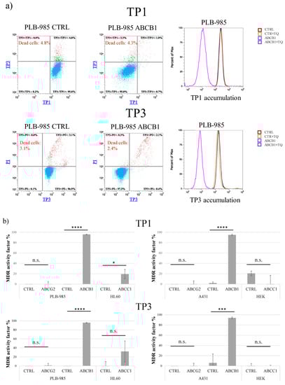 For the microplate-based TP1 or TP3 accumulation measurements control and ABCB1-expressing A431 cells were seeded (3 × 104 cells in 100 µL final volume/well) onto 96-well plates and cultured for 24 h at 37 °C, 5% CO2. The treatment was next day. The control and ABCB1-expressing PLB-985 cells were seeded (3 × 104 cells in 100 µL final volume/well) onto 96-well plates and treated. At the end of the 24-h treatment period (except for time dependence), we supplemented the cells with 100 µL of complete medium containing 5 μg/mL propidium iodide (PI). Finally, fluorescence was measured at room temperature using an Attune Nxt flow cytometer with plate reader. All experiments were performed at least three times.