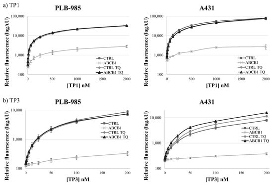 As shown in Figure 2, in the PLB-985 and A431 cells at low (200–500 nM of TP1 or 50–200 nM of TP3) concentrations, the presence of the ABCB1 protein in the cell membrane caused a major difference in the amount of the accumulated TP fluorescence. At increasing TP concentrations, the difference in cellular fluorescence caused by the ABCB1 protein still increased, while the ratio of the fluorescence in the absence and presence of ABCB1, respectively, did not increase. Based on these experiments, the suggested best conditions for assessing ABCB1/Pgp activity, in 24 h incubation periods at 37 °C, are 500 nM for TP1 and 100 nM for TP3.