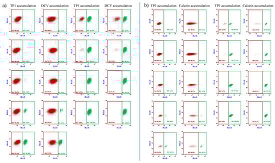 Flow cytometry detection of TP1 (a) or TP3 (b) accumulation in human PLB-985 cells: recognition and separation of control PLB-985 cells and PLB-985 cells expressing the ABCB1 transporter, respectively. Comparison to cell recognition by DCV accumulation. Control PLB-985 cells (green) and PLB-985 cells expressing wild-type ABCB1 (red) were mixed in various ratios, from 0.2% to 99.8%, respectively. TP1 accumulation was measured after incubation with 500 nM TP1 for 24 h at 37 °C. DCV accumulation was measured after the addition of 1 µM DCV (incubation for 1 h, at 37 °C). TP3 accumulation was measured after incubation with 200 nM TP1 for 24 h at 37 °C. Calcein accumulation was measured after the addition of 250 nM Calcein AM (incubation for 15 min at 37 °C).