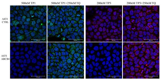 Fluorescent TP1 or TP3 accumulation in human A431 cells, examined by confocal microscopy. Effects of ABCB1 protein expression and the specific inhibition of the transporter function by Tariquidar. Cellular fluorescence was followed by confocal microscopy. TP1 fluorescence (green) or TP3 fluorescence (red) was examined after 24 h of the addition of 500 nM TP1 or 200 nM TP3 to the medium, either in the absence or presence of the transporter inhibitor (250 nM Tariquidar for ABCB1). The nuclei were counterstained with DAPI.
