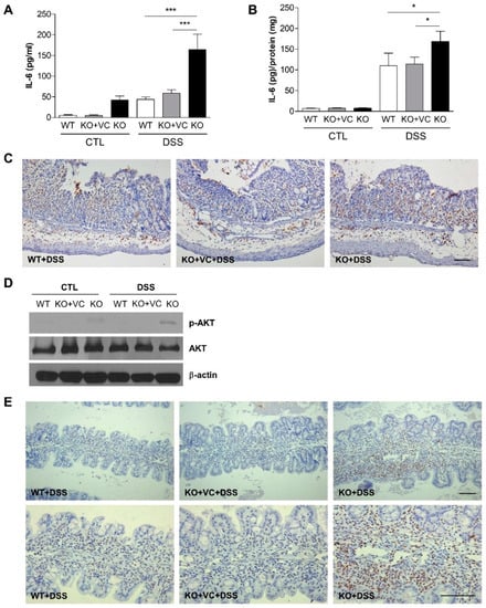 Vitamin C insufficiency and DSS treatment increase IL-6 production. Mice were treated with DSS for 7 days, and the level of IL-6 was measured in (A) plasma (n = 15–18) and (B) colon homogenates (n = 9–13) by ELISA. The final tissue IL-6 concentration was normalized to proteins in colonic homogenates. * p < 0.05, *** p < 0.001. (C) Infiltrated macrophages were stained with F4/80 antibodies. Scale bar, 100 μm. (D) Akt phosphorylation was examined in colon lysates with immunoblotting. The results are representative of three independent experiments. (E) Phosphorylated STAT3 in the colon was examined by immunohistochemistry. Scale bar, 100 μm. Statistical analysis was performed using the Tukey multiple comparisons test after one-way ANOVA.
