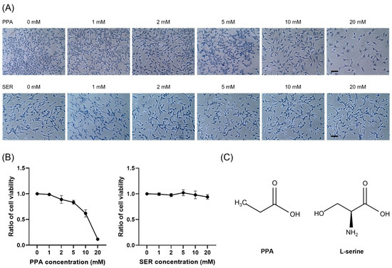 The effect of different concentrations of propionic acid (PPA) or L-serine (SER) on the viability of HT22 cells. (A) Representative images of HT22 cells stained with trypan blue. Scale bar, 100 μm. (B) Six PPA concentrations from 0 to 20 mM in DMEM medium were set. HT22 cells were incubated in a medium with different PPA concentrations for 48 h. Cell viability was measured by CCK-8 assay (n = 3 replicates). Cells were treated with equal amounts of L-serine (SER) or PPA in DMEM medium for 48 h. L-serine (SER) has no toxicity in HT22 cells. (C) Chemical structures of PPA and L-serine.