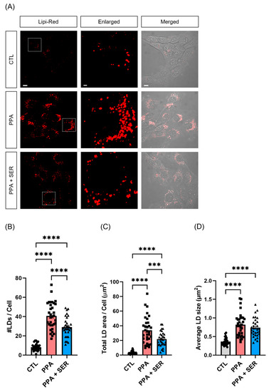 PPA induced lipid droplet (LD) accumulation in HT22 cells. Cells were treated with 5 mM PPA only or 5 mM PPA and 10 mM L-serine (SER) for 48 h. (A) Confocal imaging of HT22 incubated with red fluorescence to label lipid droplets. Scale bar, 10 µm (left, right); 2 µm (middle, the magnified images). (B–D) Quantification of Lipi-red number of puncta (B), total area (C), and average size (D) (n = 30). *** p < 0.001, **** p < 0.0001 by One-way ANOVA, Tukey’s multiple-comparison test.