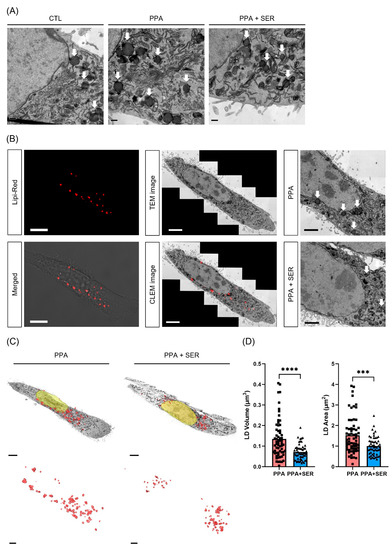 TEM showed that the lipid droplets in HT22 cells were larger in the presence of PPA (Figure 4A). We also observed the location of lipid droplet accumulation using CLEM (Figure 4B). CLEM is a powerful technique that provides both the valuable functional information given by fluorescence microscopy and the high-resolution structural information given by TEM [24]. The use of this technique allowed us to observe more clearly the location of lipid droplets using lipi-red fluorescence and the detail structures in cells under electron microscopy. We acquired serial sections and images for three-dimensional (3D) volume reconstruction, and the 3D structure was visualized with Amira software (Figure 4C). Structural analysis through 3D reconstruction revealed a significantly decreased volume and area of lipid droplets in cells co-treated with PPA and L-serine than in cells treated only with PPA (Figure 4D). These data suggested that L-serine decreased the formation and accumulation of lipid droplets induced by PPA.