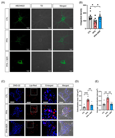 To investigate whether dysfunctional lysosomes do not degrade abnormally accumulated lipid droplets, we measured the colocalization of lipi-red and DND-22 lysotracker signal in hippocampal neurons (Figure 5C, Supplementary Figure S1B). The colocalization of total area in each group was 6.3676 ± 3.4905474 µm2 (control group), 22.0612 ± 4.4119301 µm2 (PPA group) and 10.4798 ± 4.7557928 µm2 (PPA + SER group) in hippocampal neurons. The colocalization of average puncta size in each group was 0.2592 ± 0.097189 µm2 (control group), 0.5084 ± 0.103289883 µm2 (PPA group) and 0.2658 ± 0.0679169 µm2 (PPA + SER group) in hippocampal neurons. Colocalization of the total area and average puncta size were significantly increased compared to control in PPA-treated hippocampal neurons. The colocalization of the total area and the average size were significantly decreased by co-treatment with PPA and L-serine (Figure 5D,E). These data suggested that L-serine decreased the accumulation of lipid droplets induced by PPA through the increase in lysosomal activity.