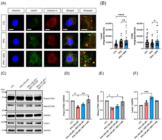 To further examine whether L-serine affects lysosomal activity in PPA-treated hippocampal neurons, we performed immunocytochemistry with the lysosome marker lamp1 and the active lysosome marker cathepsin D (CTSD) (Figure 6A, Supplementary Figure S2). Co-treatment of hippocampal neurons with PPA and L-serine significantly increased the fluorescence intensity of lamp1 and CTSD compared to treatment only with PPA (Figure 6B). We also examined the expression levels of lamp1 and CTSD in each group of hippocampal neurons with treatments (Figure 6C). The quantitation of CTSD band intensity normalized to housekeeping GAPDH signals indicated a significant increase in the level of CTSD in hippocampal neurons co-treated with PPA and L-serine. Compared to control, CTSD levels were downregulated in hippocampal neurons treated only with PPA (Figure 6D,E). The expression level of prepro CTSD (fold change) in each group was 0.675844667 ± 0.059133796 (PPA 100 µM), 0.826306333 ± 0.06993275 (PPA 100 µM + SER 100 µM) and 1.082893333 ± 0.176601 (PPA 100 µM + SER 1 mM). The expression level of mature CTSD (fold change) in each group was 0.591488 ± 0.064692 (PPA 100 µM), 0.714738 ± 0.093947 (PPA 100 µM + SER 100 µM) and 0.969378 ± 0.205194 (PPA 100 µM + SER 1 mM). Co-treatment of hippocampal neurons with PPA and L-serine showed an increased level of lamp1 compared to that in cells treated only with PPA (Figure 6F). The expression level of lamp1 (fold change) in each group was 1.206469 ± 0.169617 (PPA 100 µM), 1.597523 ± 0.096476 (PPA 100 µM + SER 100 µM) and 1.335504 ± 0.045853 (PPA 100 µM + SER 1 mM). These results provided further evidence that L-serine increased lysosomal activity in PPA-treated hippocampal neurons through regulation of CTSD levels [25].
