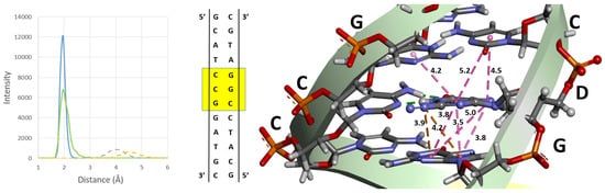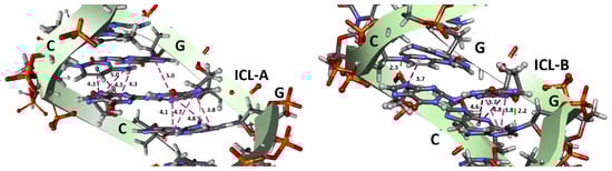 Representative structures of the ICL interactions (Å) with the base pair stacking in the oligonucleotide models are shown. The pink lines are pi–pi stacked interactions, and the green lines are hydrogen bonds.