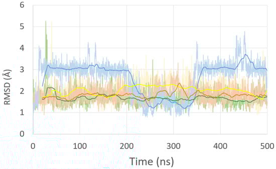 Root mean square deviation (RMSD) of the residues of the native (green), diazonium models (yellow), ICL-A model (brown), and ICL-B model (blue) during 500 ns of MD simulation.