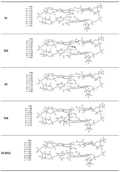 The work’s main objective is to know the reaction mechanism that yields the ICL as a final product. A representative frame of the diazonium-modified DNA simulation was chosen to achieve this. Then, DFT calculations were used to study the most reasonable steps to achieve that final product. The chosen model contains four complete nucleotides, where, in addition to the lesion and the cytosine that forms its natural base pair, the second pair of stacked nucleotides C-G is added (Scheme 1). The reaction starts with a concerted step by a hydrogen transfer of the imine of the diazonium intermediate (S1) to its cytosine counterpart and the simultaneous release of the diazonium group (nitrogen molecule output). The reaction occurs via a transition state TS2, where these changes are indicated with arrows in Scheme 1. TS2 shows how the iminic hydrogen is halfway between the lesion and the cytosine (1.36 vs. 1.41 Å) and how the N2 molecule leaves through the plane formed by the base pair. The diazonium charge is then transferred to the aromatic structure. This restructuring is kinetically viable since the energy barrier for this step is only 3.1 kcal·mol−1 (Figure 3). The formed N2 is conserved in the subsequent steps without intervening in the process, keeping a distance that is never less than 2.70 Å. With this first concerted step, a stabilization of 6.0 kcal·mol-1 from the reactant state occurs (S1). This step agrees with the thermodynamic study carried out by Glaser et al. [], who predicted a value of 8.7 kcal·mol−1 with the RHF/B3LYP/6-31G* methodology. The last step of the mechanism is the formation of the ICL. The process is carried out through TS4 also in a concerted way. TS4 shows the bond formation (1.41 Å) between Guanines through the nucleophilic attack of the amine nitrogen to the carbocation of the lesion. In this step of the reaction, there is also the transfer of hydrogen between the attacking amine of the stacked Guanine and its base pair producing the enol form of cytosine. This process is the limiting step of the reaction with an activation energy of 18.7 kcal·mol−1. However, a strong stabilization is produced (−50.8 kcal·mol−1 from the reactants) in S5, which determines the orientation of the reaction. As can be seen, the stabilization of the final product is very high, causing the equilibrium to shift towards the formation of the ICL. This mechanism shows that the inter-crosslink formation process is thermodynamically favored.
