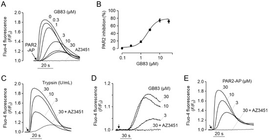 Effect of GB83 on PAR-2-mediated increase in intracellular calcium levels in HT-29 cells. (A) Inhibitory effect of GB83 on PAR2-mediated intracellular calcium increase. HT-29 cells were pretreated with GB83 at indicated concentrations and AZ3451 (1 µM) for 15 min before PAR2 stimulation by PAR2-AP (30 µM). (B) Summary of dose–responses (mean ± S.E., n = 6). (C–E) Intracellular calcium levels were increased by the indicated concentrations of trypsin, GB83, and PAR2-AP in HT-29 cells. Intracellular calcium increase induced by trypsin (30 U/mL), GB83 (30 µM), and PAR2-AP (30 µM) were inhibited by 1 µM of AZ3451, a potent and selective PAR2 antagonist.
