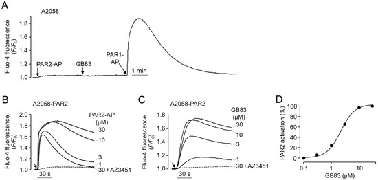 To clearly elucidate PAR2 activation by GB83, additional experiments were performed using human melanoma A2058 cells deficient in endogenous expression of PAR2. As shown in Figure 2A, application of PAR2-AP and GB83 did not change the intracellular calcium concentration in A2058 cells, but PAR1-AP treatment resulted in a rapid and robust increase in intracellular calcium concentration. To investigate the effect of GB83 on human PAR2, A2058 cells were stably transfected with human PAR2. As shown in Figure 2B, PAR2-AP strongly increased intracellular calcium levels in a dose-dependent manner in A2058-PAR2 cells. Notably, GB83 also markedly elicited intracellular calcium increase in A2058-PAR2 cells in a dose-dependent manner (EC50 = 2.1 ± 0.17 µM). Both PAR2-AP and GB83-induced increases in intracellular calcium levels were completely blocked by 1 μM of AZ3451 (Figure 2B,C). These results clearly show that GB83 is a bona fide agonist of PAR2.