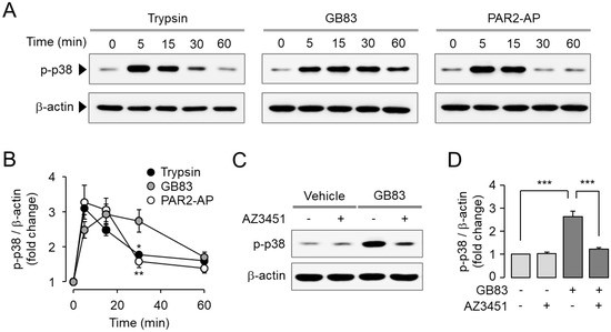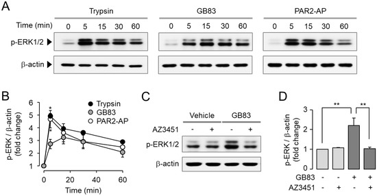 Activation of MAPKs including p42/44 (ERK1/2) and p38 is a typical signaling pathway triggered by PAR2 activation. It is well known that PAR2 promotes cell proliferation and migration via ERK1/2 and p38 MAPK signaling pathways [30,31]. To investigate the effect of GB83 on PAR2-mediated MAPK signaling compared to trypsin and PAR2-AP, HT-29 cells were treated with trypsin, GB83, and PAR2-AP. Trypsin, GB83, and PAR2-AP all significantly increased phosphorylation of ERK1/2 (Figure 3A,B). To determine whether phosphorylation of ERK1/2 by GB83 is mediated by a PAR2-mediated signaling pathway, HT-29 cells were pretreated with AZ3451. As shown in Figure 3C,D, the phosphorylation of ERK1/2 by GB83 was completely inhibited by AZ3451. In the case of p38 MAPK, GB83, trypsin, and PAR2-AP significantly stimulated phosphorylation of p38, but GB83 showed longer activation of p38 compared to trypsin and PAR2-AP (Figure 4A,B). GB83-induced phosphorylation of p38 MAPK was significantly blocked by AZ3451 (Figure 4C,D). These findings indicate that GB83 triggers phosphorylation of ERK1/2 and p38 MAPK via PAR2 activation.