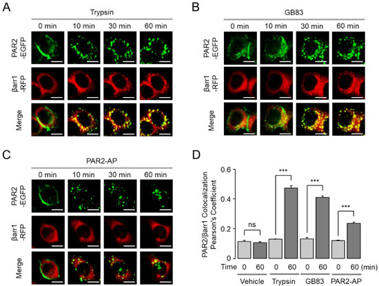 It is well known that β-arrestins bind to activated GPCRs and regulate their desensitization, signal attenuation, and receptor trafficking [17]. We examined the effect of trypsin, GB83, and PAR2-AP on translocation of EGFP-tagged PAR2 and its colocalization with RFP-tagged β-arrestin1/2. To examine the colocalization of PAR2 and β-arrestin1/2, HT-29 cells were co-transfected with EGFP-tagged PAR2 and RFP-tagged β-arrestin1 or β-arrestin2. Interestingly, trypsin- and GB83-induced internalized PAR2 demonstrated colocalization with β-arrestin1, whereas PAR2-AP-induced internalized PAR2 showed less overlap with β-arrestin1 (Figure 6). The extent of colocalization between PAR2 and β-arrestin1 was precisely quantified as Pearson’s correlation coefficient (PCC). As a result, a high degree of colocalization was induced by trypsin and GB83, whereas a low level of colocalization between PAR2 and β-arrestin1 was induced by PAR2-AP (Figure 6D). The colocalization of PAR2 and β-arrestin2 also showed similar results to β-arrestin1 (Figure 7). These results suggest that GB83 and trypsin share the capacity of inducing sustained colocalization of internalized PAR2 and β-arrestins.
