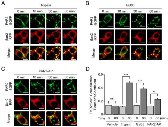 Colocalization analysis of PAR2-EGFP and β-arrestin1/2-mCherry was performed using ImageJ. Colocalization values were calculated in Pearson’s correlation coefficient from 5 representative images using the colocalization plugin Just Another Colocalization Plugin (JACoP).