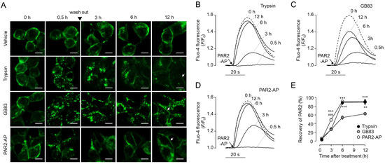 Since several studies have provided evidence for the inhibitory effect of GB83 on PAR2 [23,24,25,26,27], we attempted to investigate the possibility that GB83 interferes with recovery of cell surface PAR2. First, we observed the recovery of PAR2 on the plasma membrane after initial stimulation by trypsin, GB83, and PAR2-AP in HT-29 cells stably expressing EGFP-tagged PAR2. Interestingly, GB83 showed a more delayed recovery of PAR2 on the plasma membrane compared to trypsin and PAR2-AP. After 12 h of stimulation, trypsin and PAR2-AP treated cells restored PAR2 to pre-stimulation levels, but internalized PAR2 was still largely observed in GB83 treated cells (Figure 8A). Next, we investigated the functional recovery of PAR2 in HT-29 cells after initial stimulation with trypsin, GB83, and PAR2-AP. As shown in Figure 8B–E, non-enzymatic activation of PAR2 by PAR2-AP showed a significantly faster recovery of cell surface PAR2 compared to trypsin and GB83 3 h after stimulation. Notably, GB83 showed significantly slower recovery of cell surface PAR2 compared to trypsin and PAR2-AP 6 h after stimulation. These results showed that GB83 induces delayed functional recovery of PAR2, and this effect of GB83 on PAR2 suggests that long-term use of GB83 may exert an inhibitory effect on PAR2.