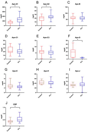 The comparison of apolipoprotein concentrations—i.e., (A) apolipoprotein A1, (B) apolipoprotein A2, (C) apolipoprotein B, (D) apolipoprotein C1, (E) apolipoprotein C3, (F) apolipoprotein D, (G) apolipoprotein E, (H) apolipoprotein H, (I) apolipoprotein J—and (J) C-reactive protein between acute lymphoblastic leukemia (ALL) survivors with normal and abnormal BMI and the control group. Data are presented as the mean ± standard deviation (SD). * p < 0.05.