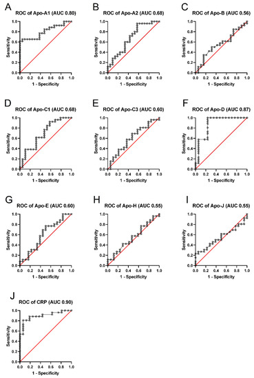 The receiver operating characteristic (ROC) analysis for the prediction of abnormal weight (i.e., overweight/obese) based on the concentrations of apolipoproteins—i.e., (A) apolipoprotein A1, (B) apolipoprotein A2, (C) apolipoprotein B, (D) apolipoprotein C1, (E) apolipoprotein C3, (F) apolipoprotein D, (G) apolipoprotein E, (H) apolipoprotein H, (I) apolipoprotein J—and (J) C-reactive protein in acute lymphoblastic leukemia (ALL) survivors.