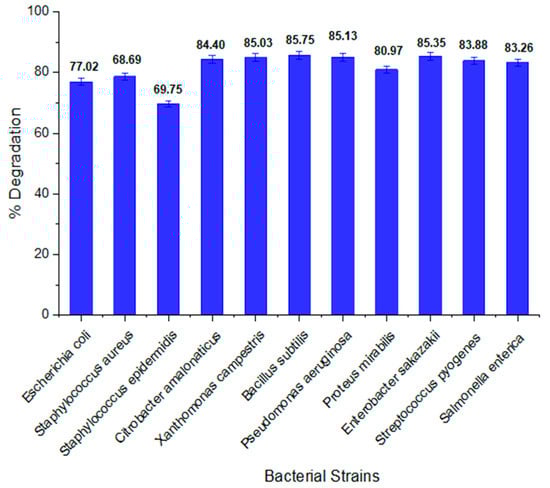Staphylococcus aureus (ATCC 27700), Staphylococcus epidermidis (ATCC 14990), Escherichia coli (ATCC25922), Citrobacter amalonaticus (ATCC25405), B. subtilis (ATCC6633), Xanthomonas campestris (ATCC-13951), Proteus mirabilis (ATCC-29906), Enterobacter sakazakii (ATCC 29544), Pseudomonas aeruginosa (ATCC27853), Salmonella enterica (ATCC43971) and Streptococcus pyogenes (ATCC12344) were used to evaluate the biodegradation capabilities. These cultures were provided by the Biotechnology Department of the University of Malakand and the Microbiology Department of Abdul Wali Khan University Mardan, Khyber Pakhtunkhwa, Pakistan.