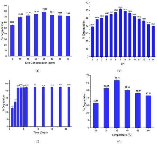 In Figure 2a, the effect of the concentration of orange II on the biodegradation rate is shown. It is clear from the percentage degradation values that highest degradation rate (78.96%) was observed for the 25 ppm dye solution, which was thus considered nontoxic for B. subtilis since a higher concentration of dye is toxic and decreases the bacterial dye degradation activity. Zhuang et al. [34] reported that bacterial activity and degradation potential are inhibited due to toxicity and the blockage of enzyme active sites with high concentrations of dye. Sunar et al. [35] claimed, in the literature, that an increase in dye concentration may cause toxicity, the inhibition of bacterial metabolic activity, saturation of the bacteria cells with dye, or blockage of the active sites of the azo reductase. The average dye content in wastewater from the textile sector is between 16 and 50 mg/L [36]. Additionally, a higher concentration of dye needs more biomass of bacteria [37]. From the above discussion, it can be stated that rate of decolorization (degradation) decreases with increasing dye concentrations. In Table S1, the percentage degradation of orange II at different concentrations is given.