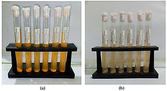Initially, the effects of various parameters on dye degradation by B. subtilis were determined. These parameters include dye concentration, sodium chloride concentration, urea concentration, sugar concentration, pH, time, temperature and redox mediators. These optimal conditions were then employed in a single final experiment. The optimum conditions determined were 25 ppm dye concentration, a temperature of 35 °C, a 1000 mg/L glucose concentration, pH 7, a 666.66 mg/L sodium chloride concentration, a 1000 mg/L urea concentration, 66.66 mg/L hydroquinone as a redox mediator, and a 3-day incubation duration. About 83.37% degradation/decolorization was achieved when these optimal physiochemical conditions were combined in one experiment. Figure 3a,b shows the orange II dye color before and after bacterial treatment under optimum conditions. There is significant decolorization, as well as visual changes, after bacterial treatment, which indicates that the dye has been degraded by the bacteria and some new products have been formed.
