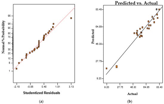 The significance of the interaction between process variables, as indicated in the relationship between the predicted and observed values, influenced orange II degradation, as illustrated in Table 2. This is reflected in the linear relationship as indicated in the percentage probability plot, and the relationship between the predicted and observed values as shown in Figure 4a,b, respectively. The evaluation of the second-order quadratic model expressing the degradation of orange II is represented in Equation (2).