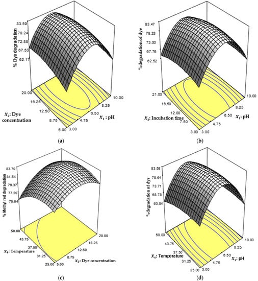 Three-dimensional surface plot for the interaction of (a) pH and dye concentration, (b) pH and incubation time, (c) dye concentration and temperature and (d) pH and temperature for the biodegradation of orange II.