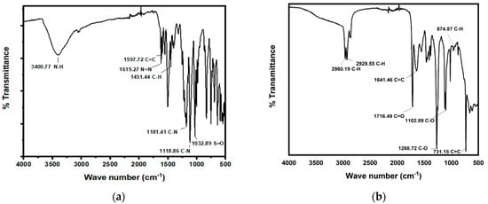 In Figure 6a, the FTIR spectra of undegraded dye is shown. The peak at 3400.77 cm−1 is attributed to amine N–H stretching, while the peak at 1619.27 cm−1 represents N=N stretching; the peak at 1597.72 cm−1 represents C=C aromatic stretching; the peak at 1451.44 cm−1 represents aromatic ring C–H stretching; the peaks at 1181.41 cm−1 and 1118.86 cm−1 correspond to the benzene ring attached to the C–N group; and the peak at 1032.89 cm−1 represents S=O stretching attached to benzene ring. Figure 6b shows the FTIR spectra of degraded dye. The peaks at 2960.19 cm−1 and 2929.55 cm−1 represent C–H stretching, while the peak at 1641.46 cm−1 corresponds to C=C stretching of the aromatic ring; the peak at 1716.49 cm−1 represents C=O stretching. The peaks at 1102.89 cm−1 and 1268.72 cm−1 represent C–O stretching; and the peak at 731.15 cm−1 represents C=C stretching of the aromatic ring. The peak at 1619.27 cm−1 corresponding to N=N stretching has disappeared, which clearly indicates a reduction in the azo bond due to the bacterial azoreductase enzyme. When the FTIR spectra of the original orange II dye reduces to the spectra of its degraded form, significant changes can be seen in their peaks. Some peaks have vanished while some new peaks have been formed, which indicates that the orange II dye has been degraded and metabolites or new compounds have been formed.