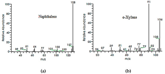 The GC and GC-MS chromatograms of the degraded dye products or metabolites are given in Figure 7 and Figure 8a,b, respectively. The orange II metabolites found at an RT of 6.99 min and an RT of 2.24 min, with charge-to-mass values of 128 and 106 m/z that closely relate to the orange II structure, were identified as naphthalene and o-xylene, as shown in Table 4. These two new compounds/metabolites were formed as a result of the breakdown of the azo dye linkage across both sides which is also clear from the FTIR spectra. Subsequent enzymatic action of the bacterial system transformed the orange II dye to naphthalene and ortho-xylene. Even the naphthalene was isolated in a pure state during isolation from the silica gel column, and its structure was also further confirmed using 1HNMR and 13C NMR analysis.