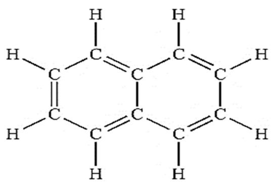 In Figure 11 the 1H-NMR analysis shows that the signal appears as two peaks at δ 7.88 and δ 7.49 ppm, with both integrated for the four H atoms. The peak at δ 39.0 ppm is due to the methyl in DMSO. Figure 12 shows three peaks, indicating the signals from three types of carbon atom on an aromatic ring. These peaks are at δ 126.42, δ 128.19 and δ 133.46 ppm, respectively. All these peaks are related to 13C on sp2 CH groups. Therefore, if the 1H-NMR and 13C-NMR analysis results in Figure 11 and Figure 12 are combined together, a chemical compound with the molecular formula C10H8 (naphthalene) is formed. The chemical structure of the isolated metabolite (naphthalene) is given below in Figure 13.