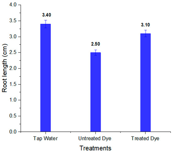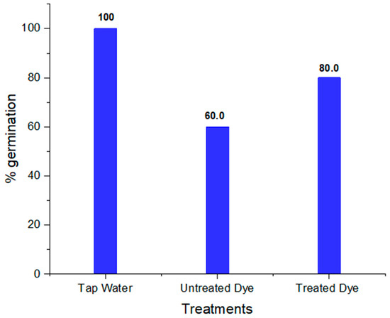 To assess the phytotoxicity of chemicals and industrial wastewaters, short-term and sensitive ecotoxicological bioassays such as seed germination and early seedling growth tests are normally utilized worldwide [67]. The seeds of Vigna radiata showed better % germination in treated dye water compared to untreated dye water. The results also revealed that that shoot and root length in treated dye water was more than in untreated dye, which shows the less-toxic nature of the dye metabolites formed; this is clear from Table 5. The percentage germination, shoot and root length in tap water, and untreated and treated orange II dye are shown in Figure 14, Figure 15 and Figure 16, respectively. Barathi et al. also reported that the metabolites produced by the degradation of the azo dye Reactive blue 160 by B. subtilis were less toxic compared to the parent dye. They conducted phytotoxicity experiments on green gram (Vigna radiata) and corn. In the case of treated dye water used for the plants, the % germination and shoot and root length were higher than those of the plant grown in untreated dye water [68].
