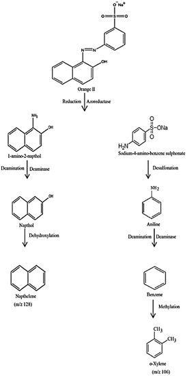 Bacteria contain enzymes such as oxidoreductase, veratryl alcohol oxidase, azoreductase, peroxidase and laccase, which allows them to break down dyes in wastewater [69,70]. A wide range of bacteria have azoreductases, such as Enterococcus faecalis YZ 66, Pseudomonas sp. and Bacillus sp. [71,72,73]. Aerobic bacteria have oxidoreductive enzymes that can symmetrically or asymmetrically split dye molecules. They could also cause deamination and desulfonation. As a result, aerobic bacteria can break down different dye structures [74]. The enzyme azoreductase present in bacteria breaks the azo bond (–N=N– bond) in both anaerobic and aerobic conditions. Through the action of the azoreductase enzyme, the azo linkage is broken and reduces orange 2 dye, consequently, to two substituted benzene derivatives, which are 1-amino-2-napthol and sodium 4-aminobenzenesulfonate. Through the deamination process, the deaminase enzyme of bacteria could convert 1-amino-2-naphthol to naphthol. At last, the dexydroxylase enzyme of bacterial system converts naphthol to naphthalene. The other part of the dye molecule, sodium 4-aminobenzenesulfonate, through desulfonation, is converted into aniline. Afterwards, the aniline is converted to benzene via the deamination process through the deaminase enzyme. The methylation of benzene forms o-xylene in the last step of the reaction. In a bacterial system, the methyl donors; methyl tetrahydrofolate and S-adenosyl-methionine are already present and are claimed to ensure the methylation of benzene [75]. Figure 17 shows the proposed and possible mechanisms for the orange II degradation by the B. subtilis strain.