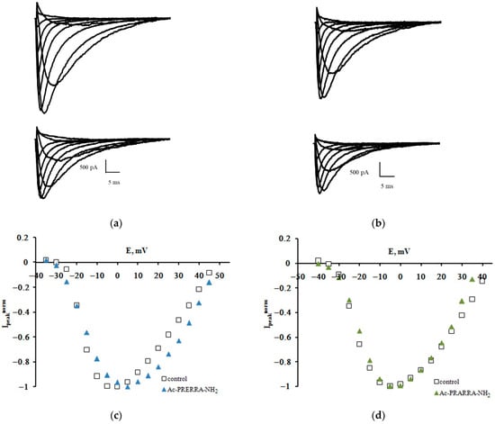 Families of NaV1.8 sodium currents recorded in the control experiment and after the extracellular application of the Ac-PRERRA-NH2 and Ac-PRARRA-NH2 hexapeptides at 100 nM are shown in Figure 1a,b. It can be clearly seen that the amplitude values of the currents decrease in the course of the experiment, which results from the rundown effect inherent to the patch-clamp method []. The regular protocol [,] was applied to obtain normalized peak current–voltage characteristics of the sodium currents (Figure 1c,d).