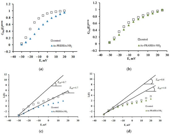 These characteristics were analyzed further to quantify the effective charge transfer (Zeff) carried by the NaV1.8 channel activation gating system. The Zeff value is a quantitative measure of the NaV1.8 channel voltage sensitivity, a parameter of great physiological importance []. This parameter was introduced by Almers as the gating charge and was measured by the limiting logarithmic potential sensitivity function []. To evaluate it, the dependences of the chord conductance on the transmembrane potential difference GNa(E) were plotted based on experimental recordings. The changes in the steepness of the GNa(E) initial branch resulting from the application of Ac-PRERRA-NH2 and Ac-PRARRA-NH2 are more readily observed when normalized GNanorm(E) functions are constructed (Figure 2a,b). As a rule, the Boltzmann distribution is used to describe these functions. However, in the present case, it cannot be based on parameters that have a simple physical meaning. A fundamentally different approach first proposed by the creators of the membrane ionic theory [] and then modified and elaborated by Almers [] is, therefore, applied, which allowed us to construct Almers’ logarithmic voltage sensitivity function, L(E).