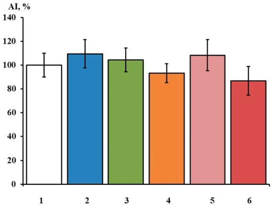 Effects of arginine-containing short peptides on neurite growth in DRG explants in control conditions (1) AI = 100 ± 10% (n = 20) and after the application of 100 nM peptides: (2) Ac-PRERRA-NH2 AI = 110 ± 12%, (3) Ac-PRARRA-NH2 AI = 105 ± 10%, (4) Ac-RAR-NH2 AI = 93 ± 8%, (5) Ac-RAAR-NH2 AI = 108 ± 13%, (6) Ac-REAAR-NH2 AI = 89 ± 12%. The ordinate axis—area index (AI, %). Data are presented as mean ± SEM (not significant, p > 0.5) (n = 16–26).