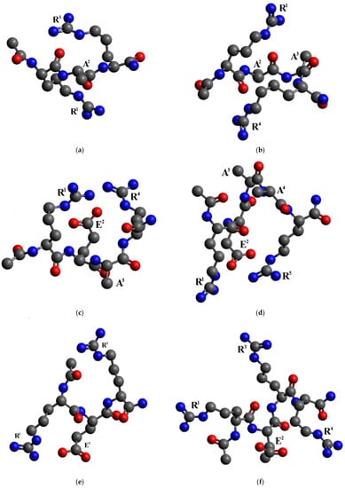 It is worth noting that a set of only four amino acid residues, arginine (R), alanine (A), glutamic acid (E), and proline (P), was intentionally used to design the aforementioned and currently investigated peptides. Their terminal functional groups were made electrically neutral at physiological pH with N-terminal acylation and C-terminal amidation to eliminate the unnecessary charged moieties. Pharmacologically, this should protect the peptides from possible cleavage caused by exopeptidases during delivery to their molecular target, located in the peripheral nervous system. Structurally, the integration of additional centers of charge into the peptide molecule would strongly increment the number of different patterns of intramolecular electrostatic interactions. As a considerable consequence, the ensemble-averaged values of structural parameters might lose statistical significance due to high data dispersion. Given these limitations, the peptide conformations are expected to be mainly controlled by electrostatic repulsion between the guanidinium groups, which are always positively charged even in the bulk of the protein [], and their attraction to the negatively charged glutamic acid carboxyl group. The prolines were suggested for the role of a rigid and sterically constrained spacer, while the alanine and glutamic acid residues were used to introduce the amino acid with non-bulky neutral or small and flexible negatively charged side chain, respectively, in an attempt to gain control over the distances between guanidinium groups without significant changes in the molecular volume when designing new arginine-containing short peptide molecules.